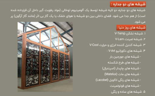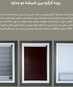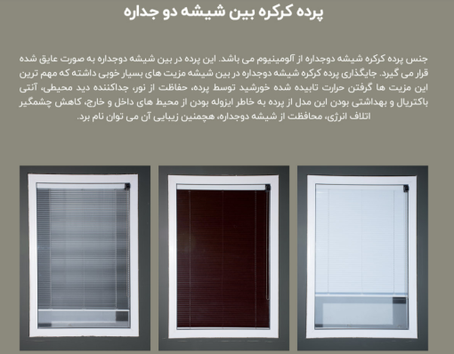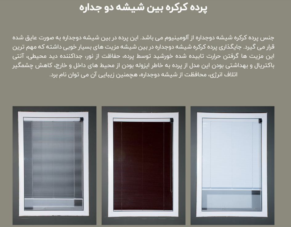 مادة الستارة ذات الزجاج المزدوج مصنوعة من الألومنيوم. هذه الستارة معزولة بين الزجاج المزدوج الزجاج. يتميز وضع ستارة زجاجية مزدوجة الزجاج بين الزجاج بالعديد من المزايا ، من أهمها امتصاص الستارة لحرارة الشمس ، والحماية من الضوء ، والفصل البيئي ، والبكتيريا ، والطبيعة الصحية لهذا النموذج من الستارة لما لها من العزلة عن البيئة الداخلية والخارجية ، تقليل كبير في فقد الطاقة ، حماية الزجاج المزدوج الزجاج ، كل جمالها يمكن ذكره.